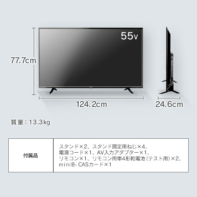 ●HDMI端子HDMI Ver.2.0標準規格×3、ARC対応(HDMI3)●USB(録画専用)USB2.0端子×2●AV入力3.5mm4極ミニジャック×1(映像、左音声、右音声)※付属のAV入力アダプターを使用●音声出力光デジタル音声出力×1、φ3.5mmステレオミニジャック×1●LANLANポート(RJ45)×1※データ放送用●アンテナ端子地上デジタル×1/BS・110°CSデジタル×1●画面サイズ:55V型●チューナー数:地上デジタル×2、BS・110°CSデジタル×2 ※1●画素数(水平×垂直):3840×2160●コントラスト比(標準値):4500:1●応答速度:6.5ms (TYP)●視野角(最小値):左右約178°(TYP)/上下約178°(TYP)●スピーカー:2チャンネル、10W+10W●電源電圧:AC100V 50/60Hz●定格消費電力:150W●年間消費電力量:237kWh/年 ※2●省エネ達成率:105%●電源ケーブル長さ:約1.5m●商品サイズ(cm):幅約124.2×高さ約77.7×奥行約24.6●質量:約13.3kg●付属品:付属品:スタンドベース×2個、スタンドベース固定ネジ×4個、電源コード、AV入力アダプター、リモコン、リモコン用単4乾電池(テスト用)×2個、mini B-CASカード×1枚、取扱説明書、保証書1※1 ダブルチューナーの1つは視聴専用チューナーのため、2番組同時録画には対応していません。